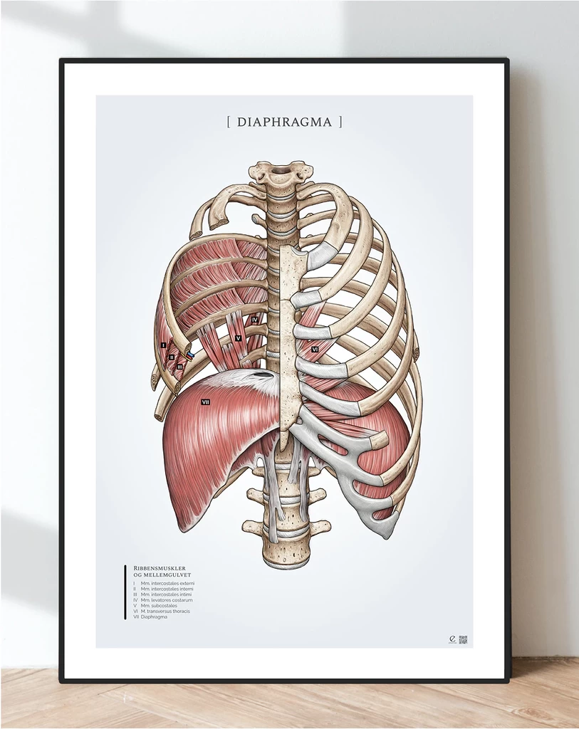 El póster de anatomía que se presenta aquí se llama Diafragma, también llamado músculo respiratorio. Sin embargo, el póster incluye más que Diafragma, con una presentación educativa de los demás músculos costales, así como de los vasos y nervios intercostales de importancia clínica. Los músculos costales están agrupados, numerados y nombrados con encabezados en danés y latín puro en una lista simple y clara. La ilustración incluye: El esqueleto en la región torácica con cortes educativos en las costillas para que los músculos costales sean lo más visibles posible. Ilustración de todos los músculos del grupo muscular costal. Aunque algunos músculos se encuentran a lo largo de toda la columna vertebral o de toda la costilla, solo se ilustran partes seleccionadas de los músculos con fines educativos. Los músculos intercostales son visibles a través de una sola costilla incisa. En general, el póster ofrece una visión general educativa, tanto visual como textual, lo que facilita la visualización y la repetición de los músculos respiratorios y costales. El póster se entrega en formato de 50 x 70 cm con impresión de alta calidad. ¡NOTA! Este póster forma parte de nuestra nueva serie, denominada "pósteres clínicos". El contenido de la serie se basa en nuestro ingenioso y completo póster de músculos EA5 y, a partir de ahí, profundiza en los grupos musculares individuales, tanto visual como textualmente. Nuestros pósteres clínicos están diseñados con estética y simplicidad. Con un diseño limpio y sobrio, pueden utilizarse en diversos contextos, tanto como herramienta didáctica como parte de un diseño interior profesional y elegante. ¡NOTA! Marco no incluido.