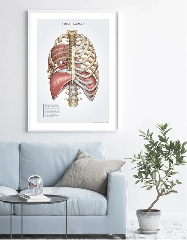 Póster de anatomía: diafragma, músculos respiratorios y músculos costales.