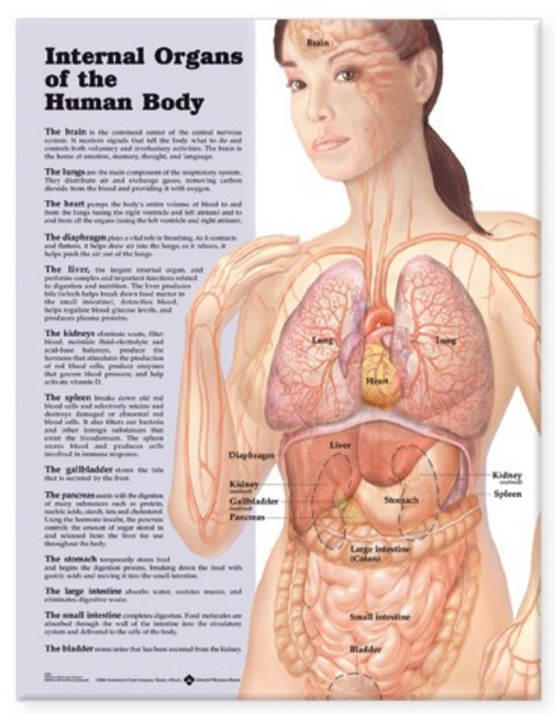 El póster muestra una descripción general fácil de entender de la ubicación y la función de los órganos internos más grandes del cuerpo: corazón, pulmones, estómago, riñones, diafragma, bazo, hígado, páncreas, intestino delgado, intestino grueso, vesícula biliar, vejiga urinaria y cerebro. Perfecto para pacientes y estudiantes.