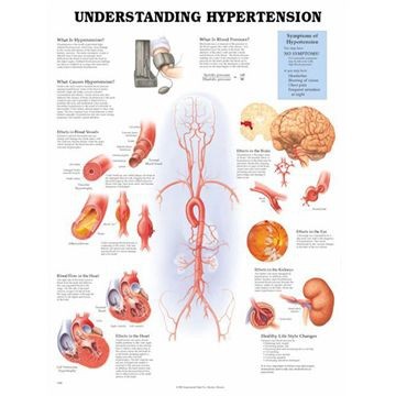 Define la hipertensión arterial y sus causas, así como la presión arterial. Enumera las causas comunes y los hábitos de vida. Ilustra los efectos secundarios de la hipertensión en los vasos sanguíneos, el corazón, el cerebro, los ojos y los riñones. Tamaño: 51 x 66 cm.