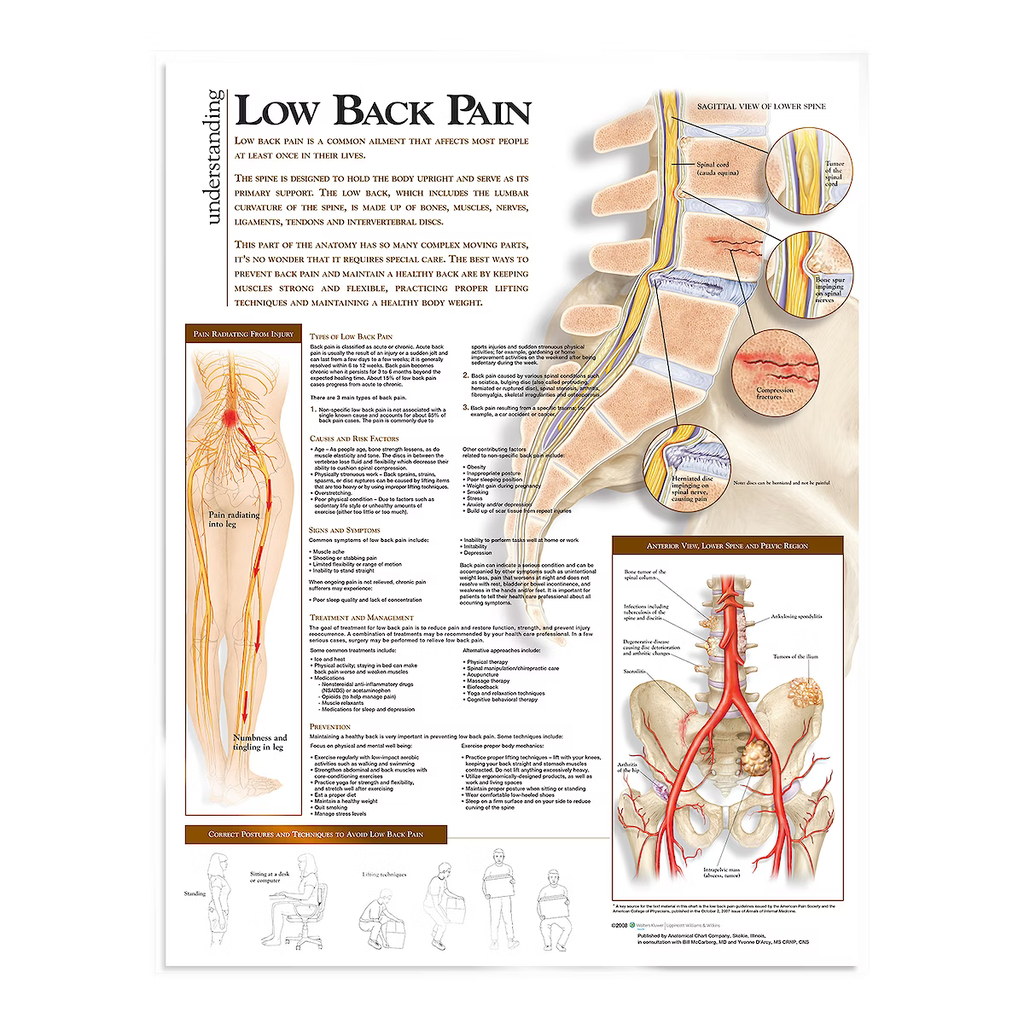 El póster laminado está impreso en EE. UU. y mide 20 x 26 pulgadas, lo que corresponde a 51 x 66 cm. El dolor lumbar es una dolencia que afecta a la mayoría de las personas al menos una vez en la vida. Utilizando las últimas directrices sobre dolor lumbar de la American Pain Society (APS) y el American College of Physicians (ACP) como referencia, esta descripción general visual y escrita de la afección explica: Tipos de dolor lumbar Causas y factores de riesgo Signos y síntomas Tratamiento y manejo Prevención Este póster ilustra: Una figura humana (vista posterior) con dolor que se irradia por la pierna y entumecimiento y hormigueo en las piernas. Vista sagital de la columna lumbar: tumor de la médula espinal, pinzamiento del nervio espinal causado por osteofito, factores de compresión y pinzamiento del nervio espinal causado por hernia discal. Vista anterior de la columna lumbar y la pelvis que muestra tumores, infecciones, enfermedades degenerativas, espondilitis anquilosante, sacroileítis, osteoartritis y masa intrapélvica. Posturas y técnicas correctas para evitar dolores lumbares.