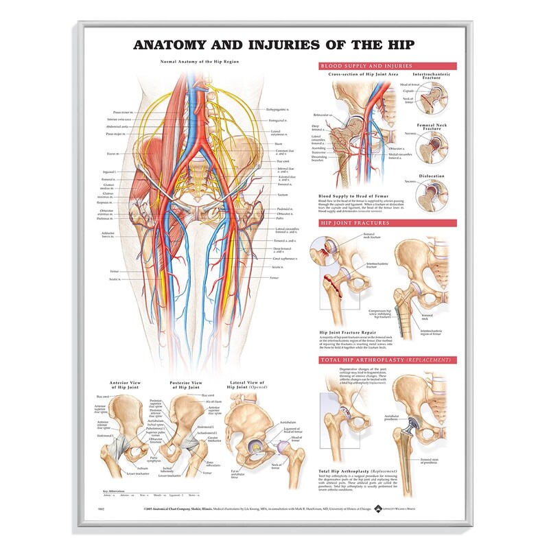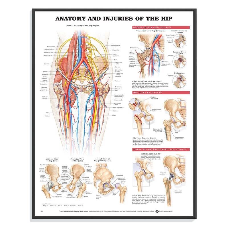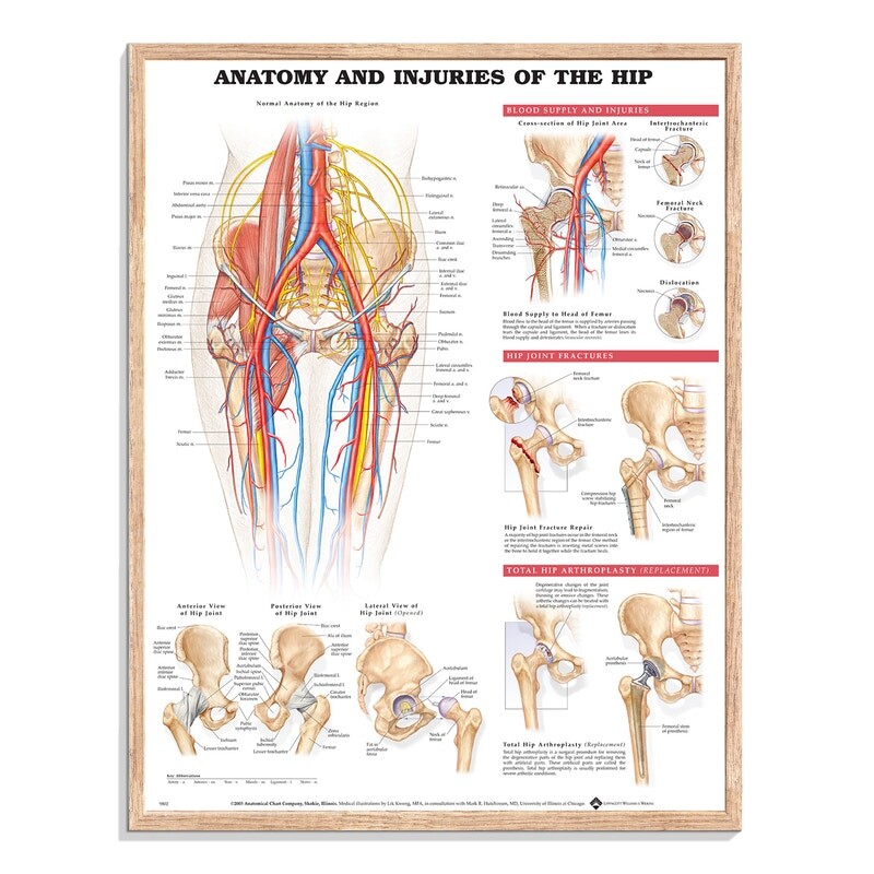 La laminación de 75 micras, realizada por nosotros mismos, hace que el póster sea repelente al agua y más resistente al desgaste. Se puede escribir con un rotulador sin dañar el póster. Los pósteres se imprimen en EE. UU. y miden 50 x 66 cm. Convertidas a medidas suecas, incluyendo algunos milímetros para la laminación, las dimensiones son 51 x 66 cm.Ilustra la anatomía general de la cadera, incluyendo huesos, músculos, arterias, venas y nervios. Muestra la articulación de la cadera desde delante, desde atrás y de lado. Se analiza el suministro de sangre y lesiones como la fractura intertrocantérea, la fractura del cuello femoral y la dislocación, así como la forma en que se reparan las lesiones, por ejemplo, mediante una artroplastia de cadera.
