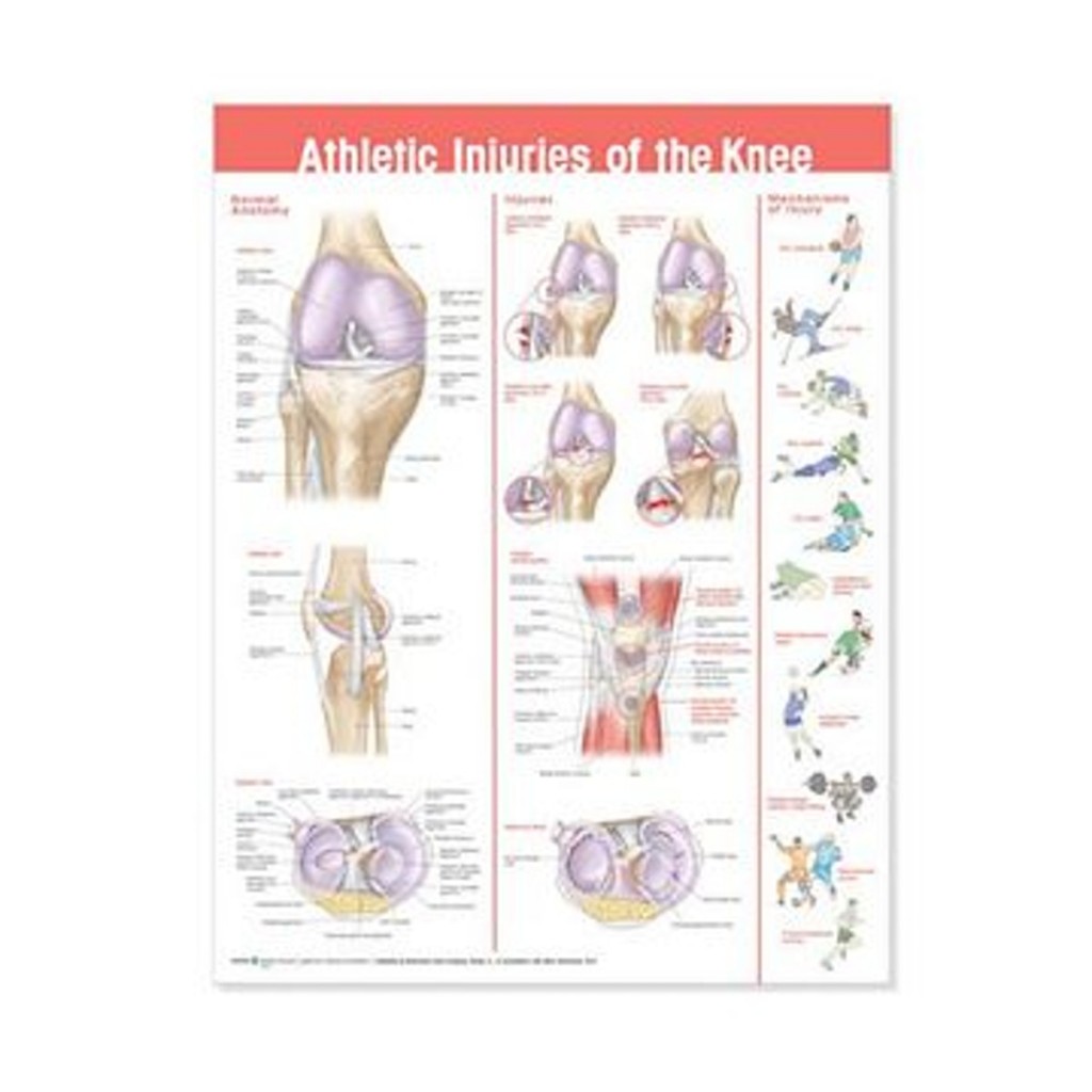 Póster laminado sobre lesiones de rodilla tras la práctica deportiva.