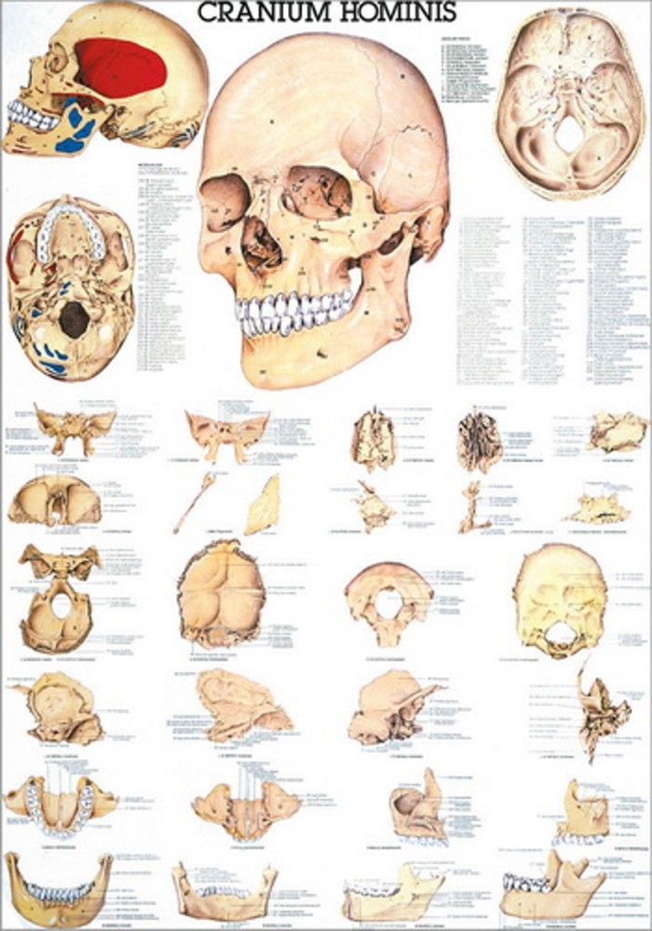 El póster muestra el cráneo y sus huesos. Las estructuras relevantes se nombran en latín. Algunas palabras están en alemán.
