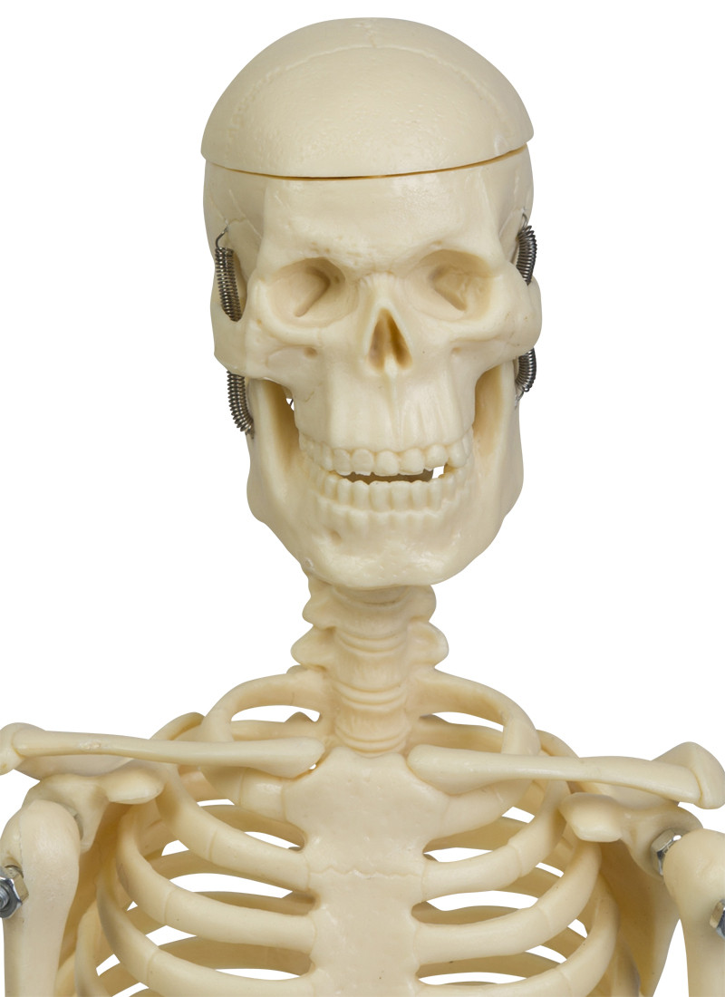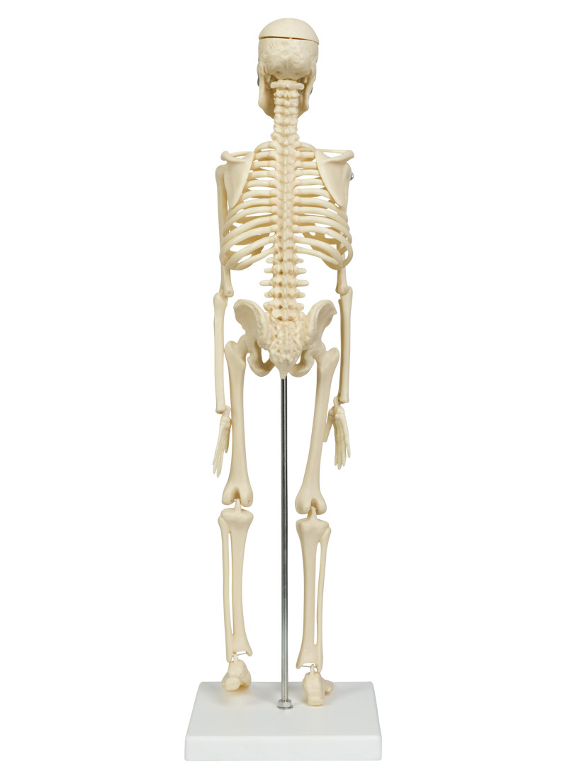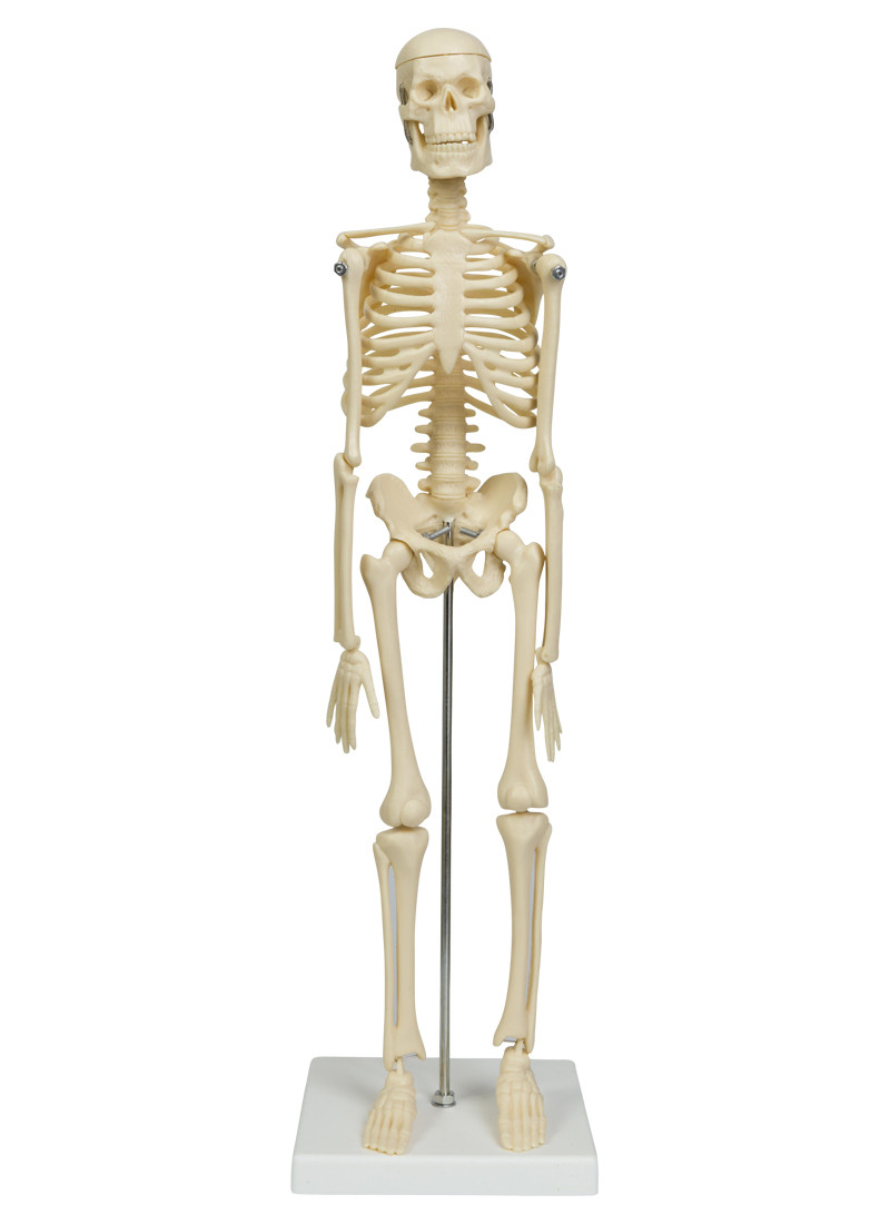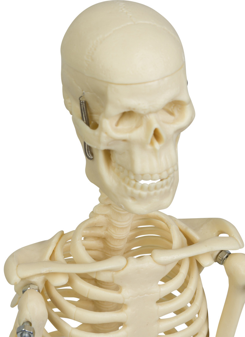 El esqueleto mide 45 cm de alto y muestra el esqueleto de cada hueso, excepto las vértebras y los huesos de la mano y el pie. El mini esqueleto puede utilizarse como introducción a la anatomía esquelética. Tenga en cuenta que los huesos no están lo suficientemente detallados como para comprender los puntos del folleto. Se observa movimiento en las articulaciones del hombro, el codo, la muñeca, la cadera, la rodilla y el tobillo. El cráneo consta de tres partes, con mandíbula móvil y parte superior extraíble.