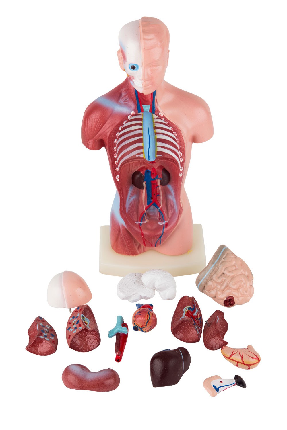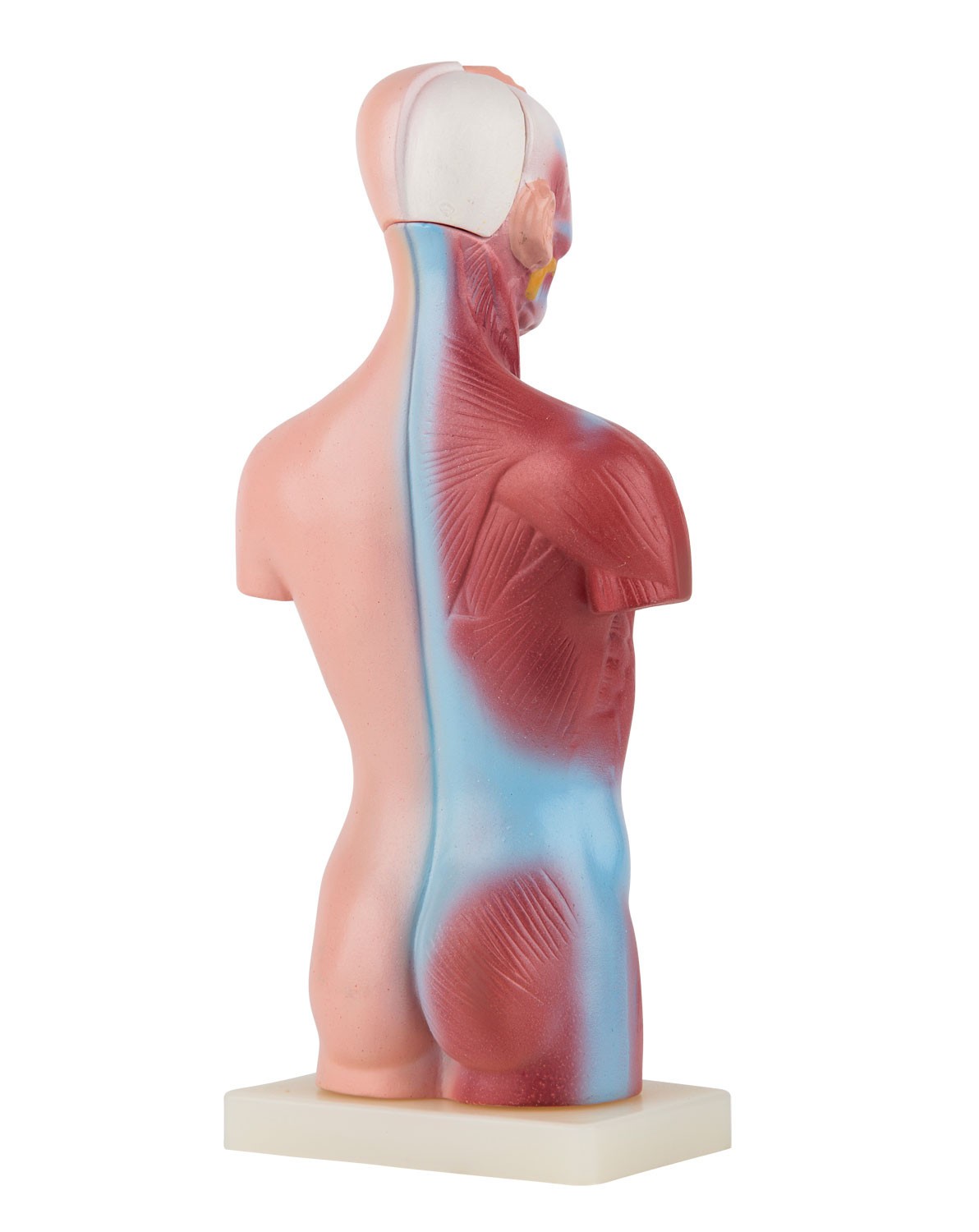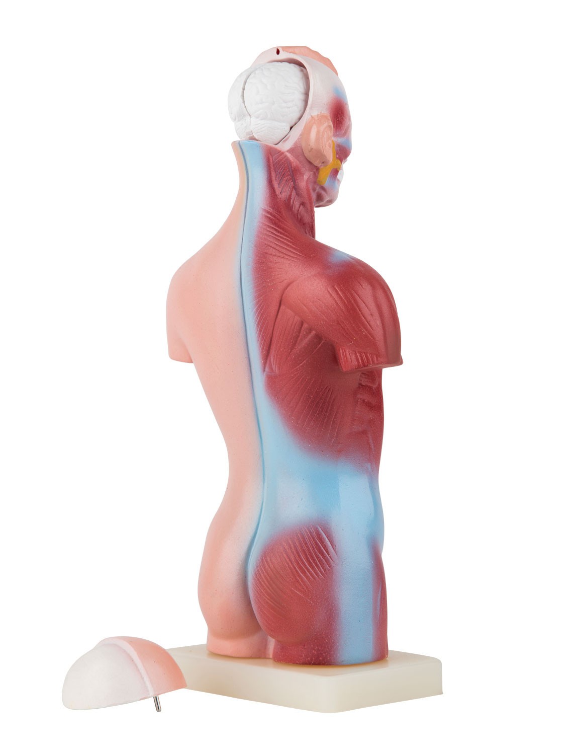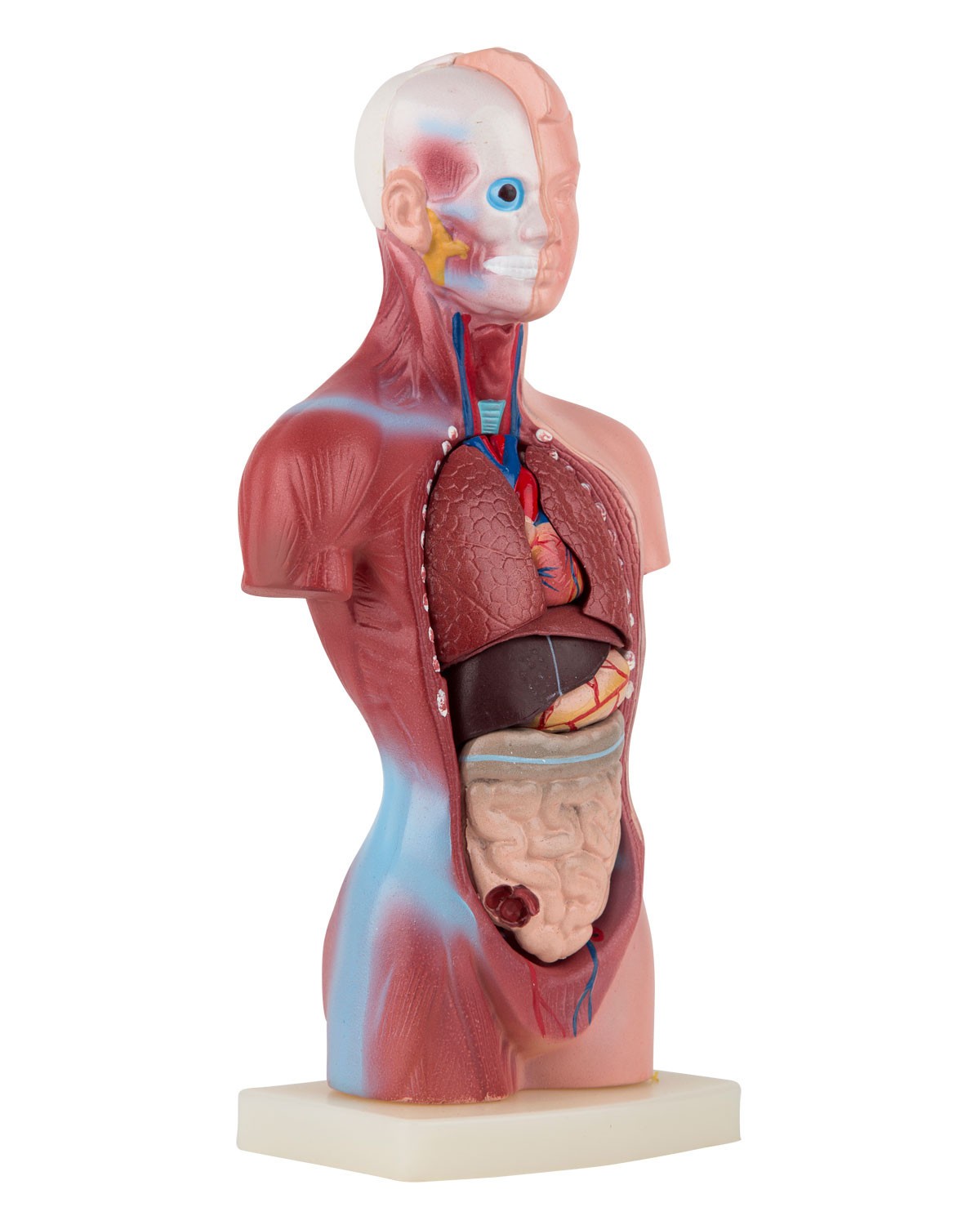 Este pequeño y popular mini torso mide tan solo 26 cm de altura. A pesar de su tamaño, se puede desmontar en 15 partes. Puede ser un regalo divertido o servir como herramienta para explicar la ubicación y forma básicas de los órganos humanos. El torso consta de las siguientes partes sueltas: cabeza trasera desmontable, cerebro en dos partes, pulmones en cuatro partes, corazón, esófago, tráquea y aorta, diafragma, hígado con vesícula biliar, estómago, duodeno y bazo, y sistema intestinal. Además de la posibilidad de desmontar las partes sueltas mencionadas, el torso muestra la musculatura superficial de la parte frontal y posterior derecha, aunque con menos detalle. Se ven tanto los músculos de la mandíbula como toda la espalda, incluyendo la musculatura del hombro. Tenga en cuenta que las piezas sueltas pueden requerir un poco de paciencia para volver a colocarlas en su lugar después de retirarlas.