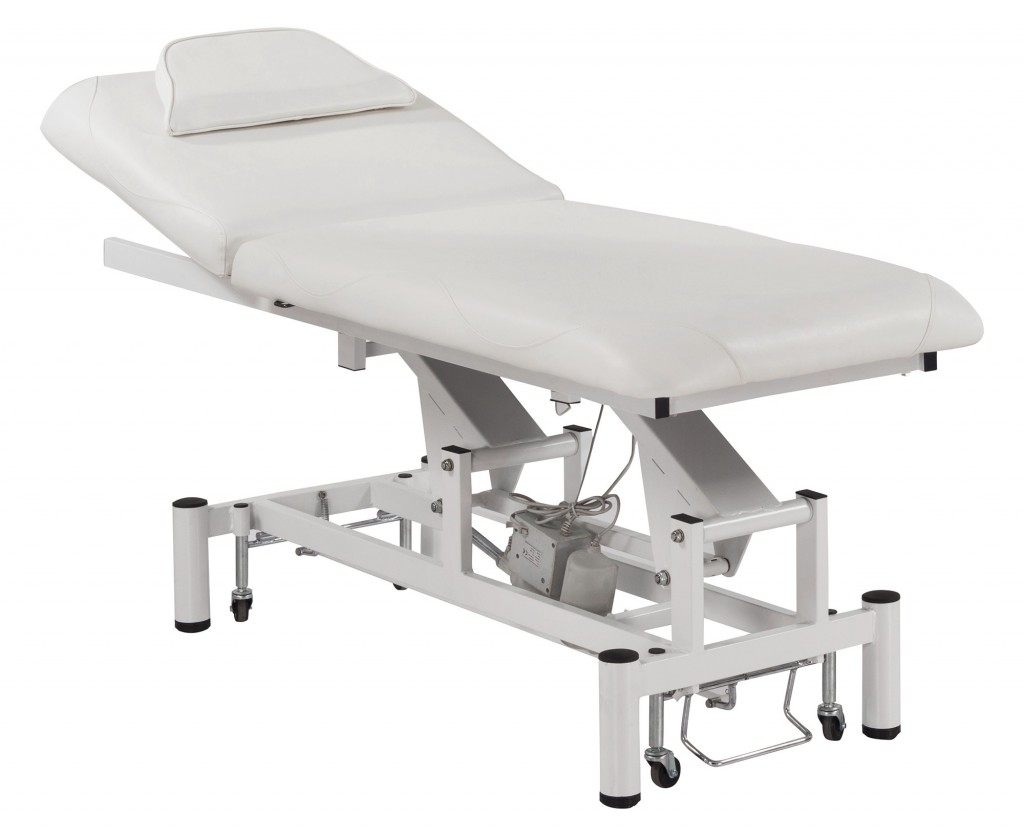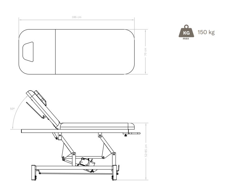 Cama de exploración de 2 piezas asequible, con altura ajustable mediante un motor y ángulo del respaldo ajustable mediante un pistón de gas.