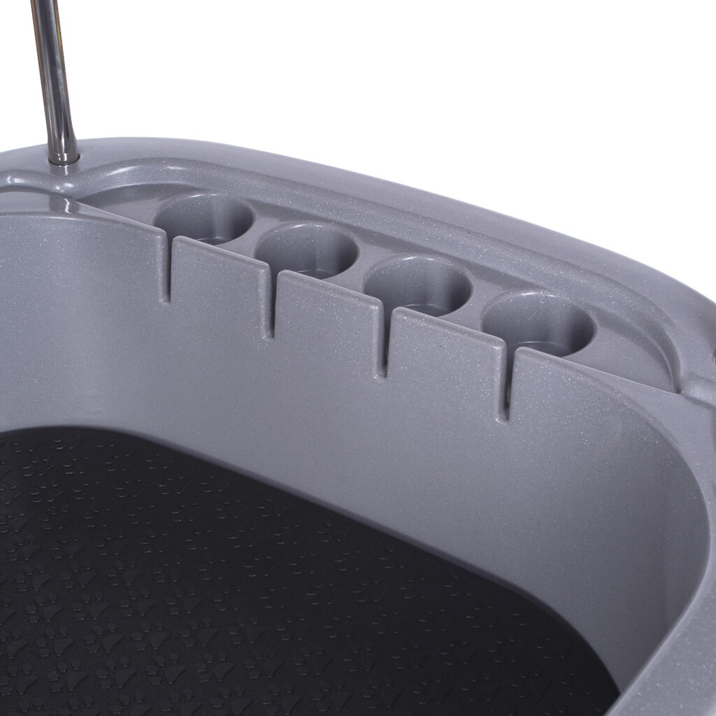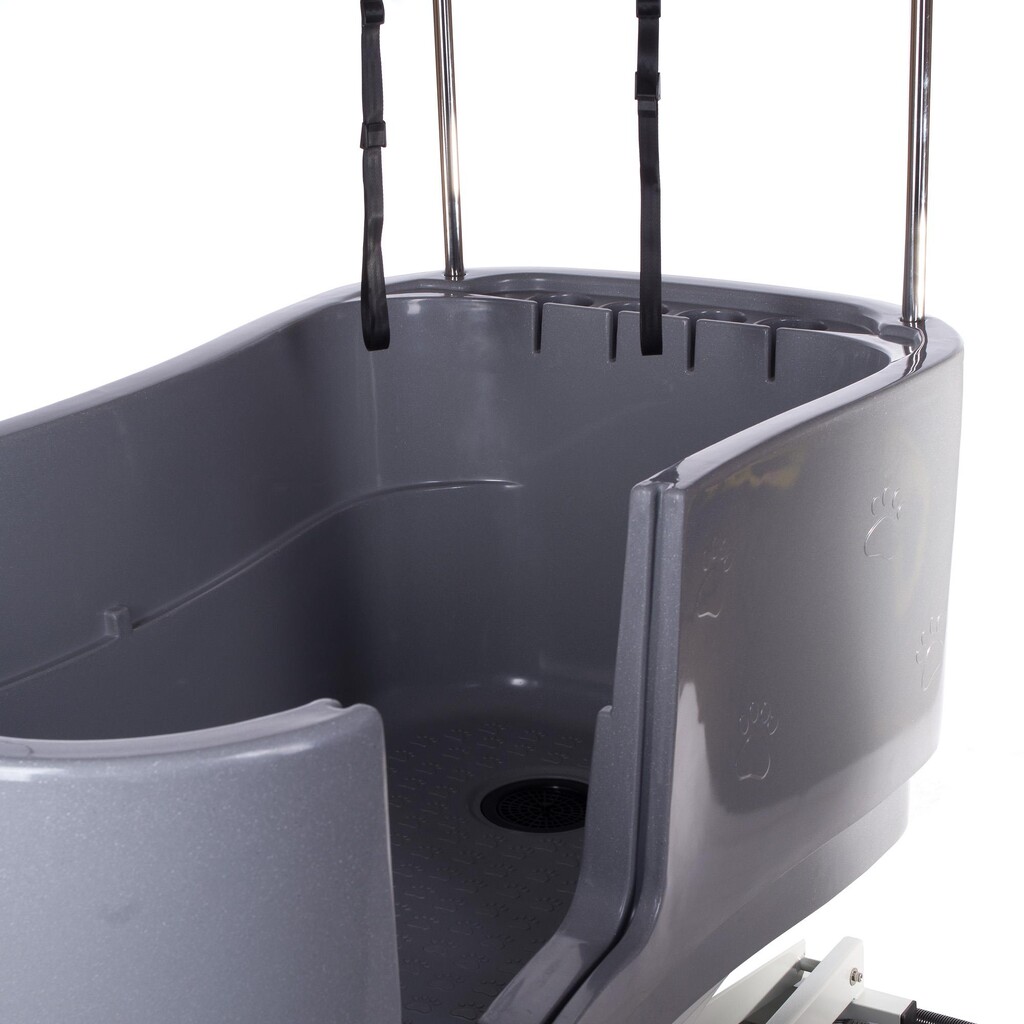 La altura ajustable se controla fácilmente con pedales, lo que proporciona una posición de trabajo ergonómicamente correcta para peluqueros y dueños. Tres correas en el brazo garantizan que el animal se mantenga en su lugar durante el baño y el tratamiento. La bañera también cuenta con espacio para guardar frascos de cosméticos en el borde y una base antideslizante para mayor seguridad.